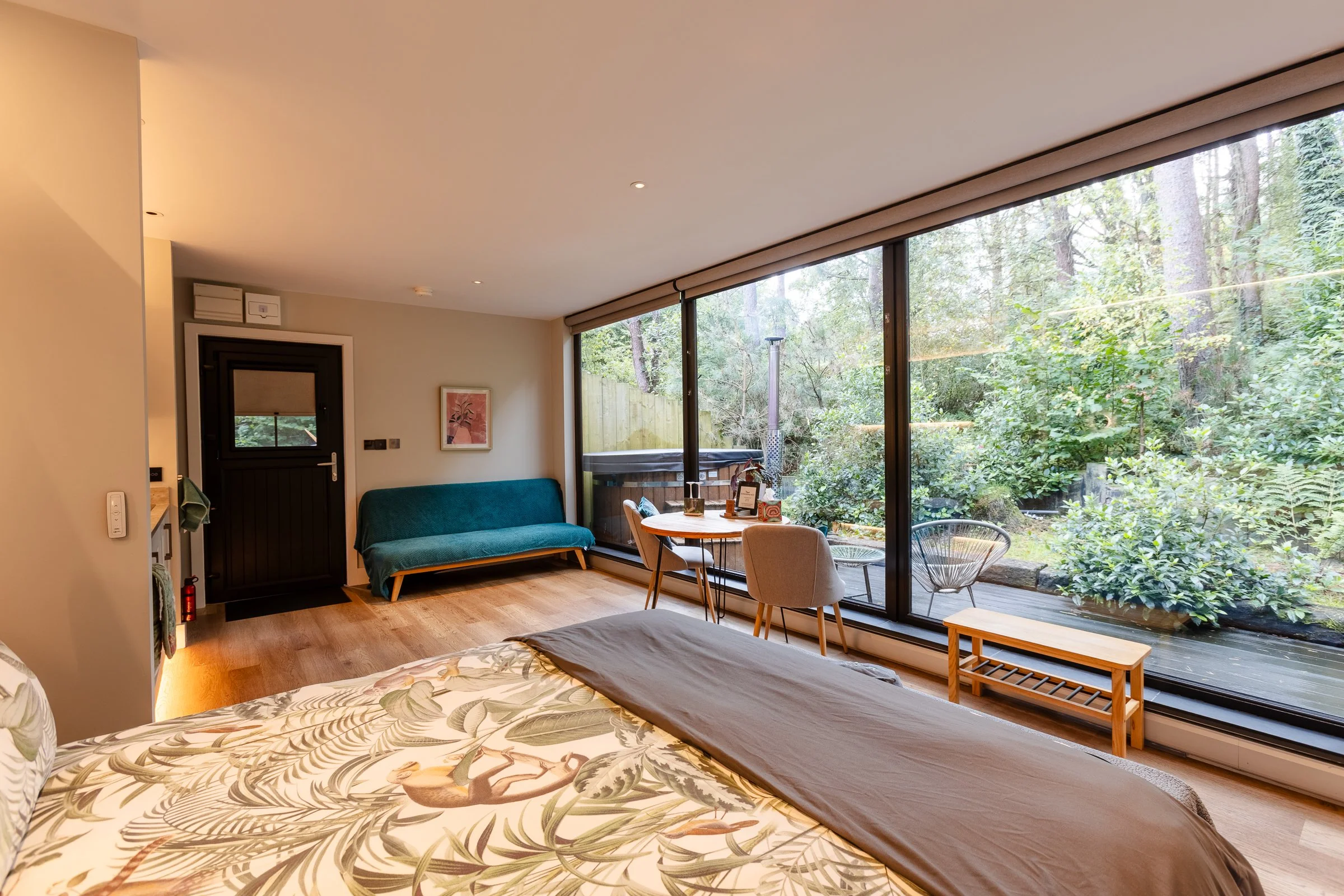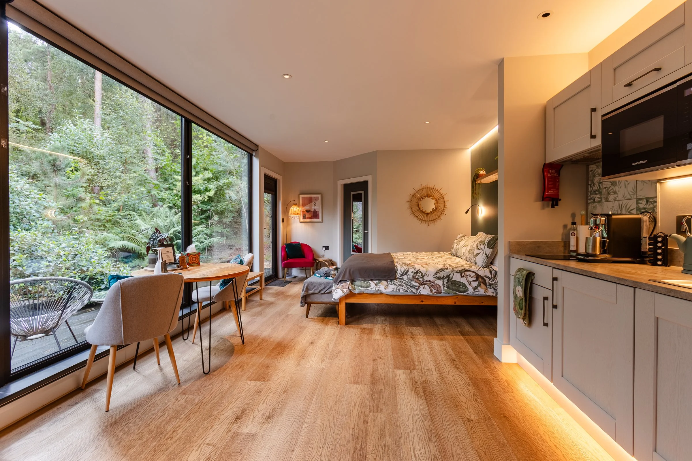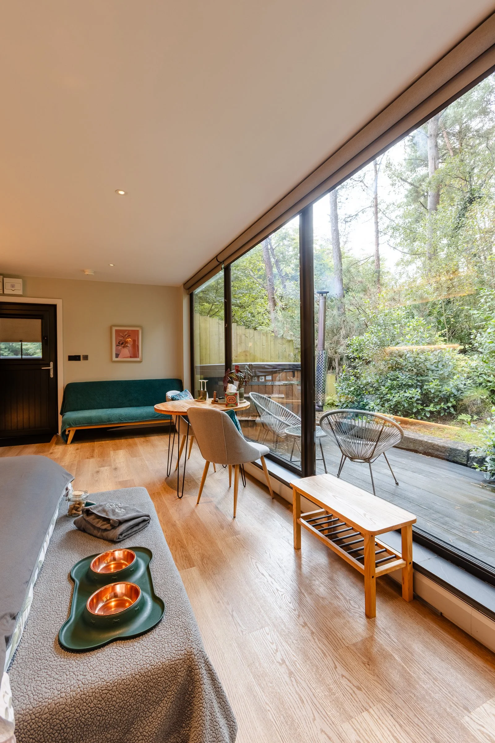 Pipit’s Hide, our luxury ground-floor lodge, with private patio is surrounded by breath-taking woodland.